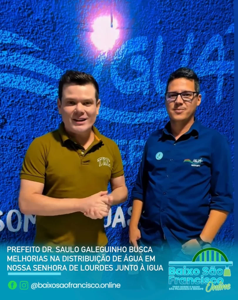 O prefeito de Nossa Senhora de Lourdes, Dr. Saulo Galeguinho, deu mais um importante passo em defesa da população lurdense. Em visita à sede da IGUA Saneamento, nova empresa responsável pela distribuição de água em Sergipe, o gestor municipal se reuniu com o diretor operacional da região Norte, Fernando, para tratar das melhorias na qualidade do atendimento e da distribuição de água no município.