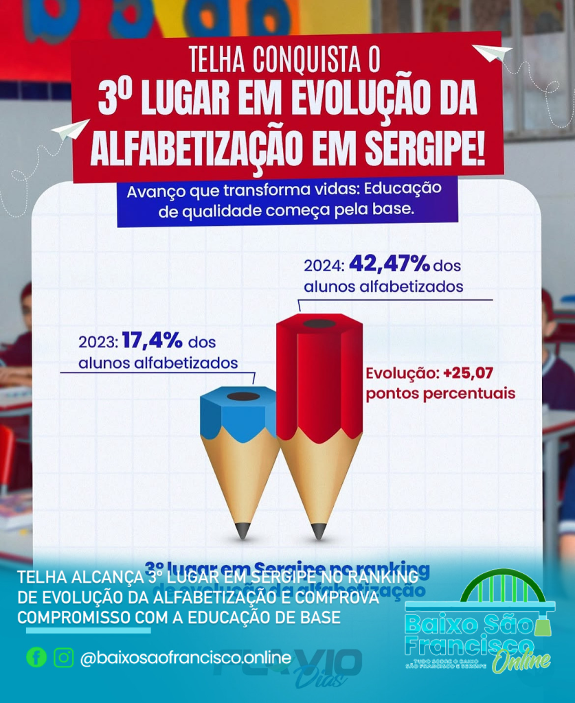 O município de Telha comemora uma conquista histórica: o 3º lugar no ranking de evolução da alfabetização em Sergipe, entre os anos de 2023 e 2024. O resultado coloca o município entre os que mais avançaram na aprendizagem dos alunos em fase de alfabetização, com um salto impressionante de 25,07 pontos percentuais – saindo de 17,4% para 42,47% de alunos alfabetizados.