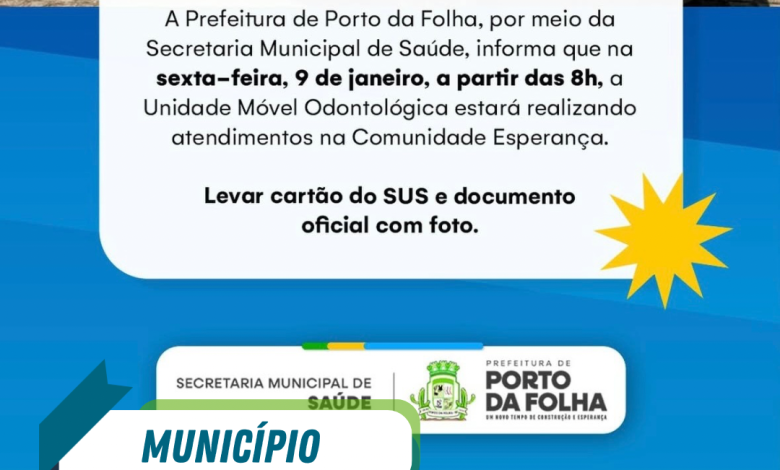 A Prefeitura de Porto da Folha, por meio da Secretaria Municipal de Saúde, informou que na sexta-feira, 9 de janeiro, a partir das 8h, a Unidade Móvel Odontológica estará realizando atendimentos na Comunidade Esperança, em Porto da Folha.